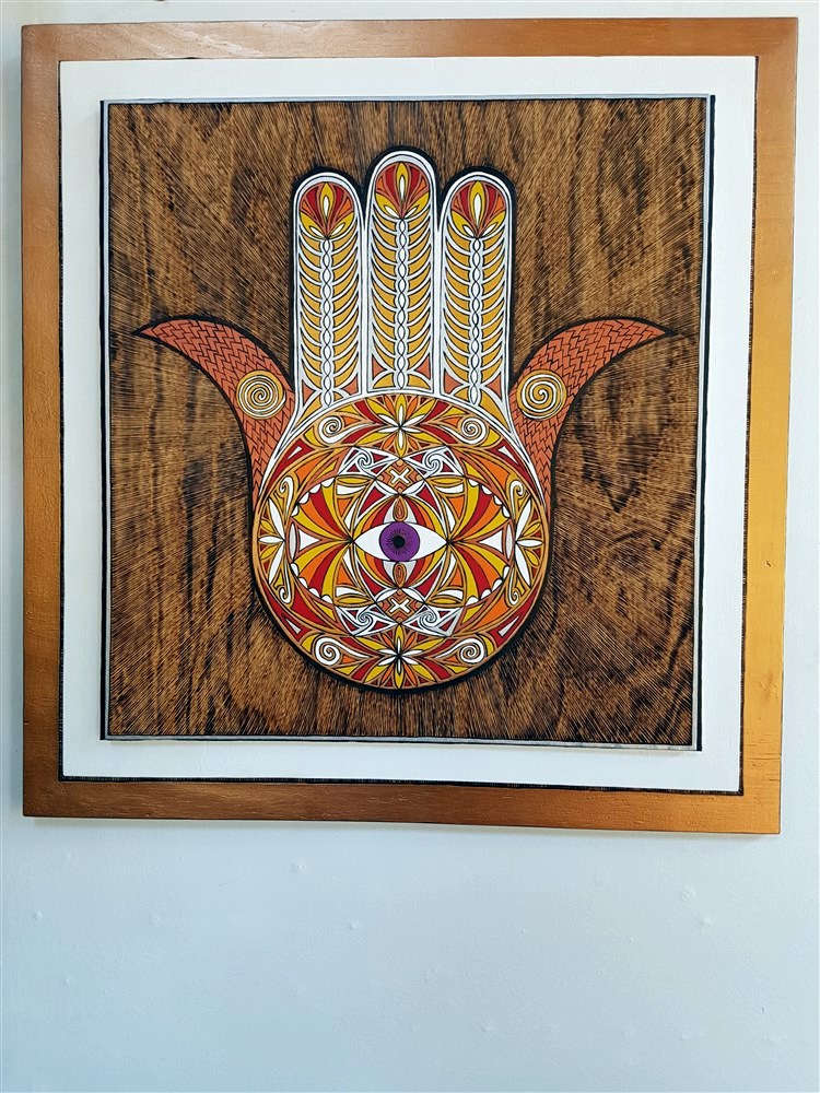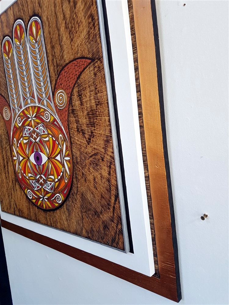 The Hamsa Hand is an ancient amulet symbolizing the Hand of God. In all faiths it is a protective sign. In this depiction Autumn brings its owner happiness.